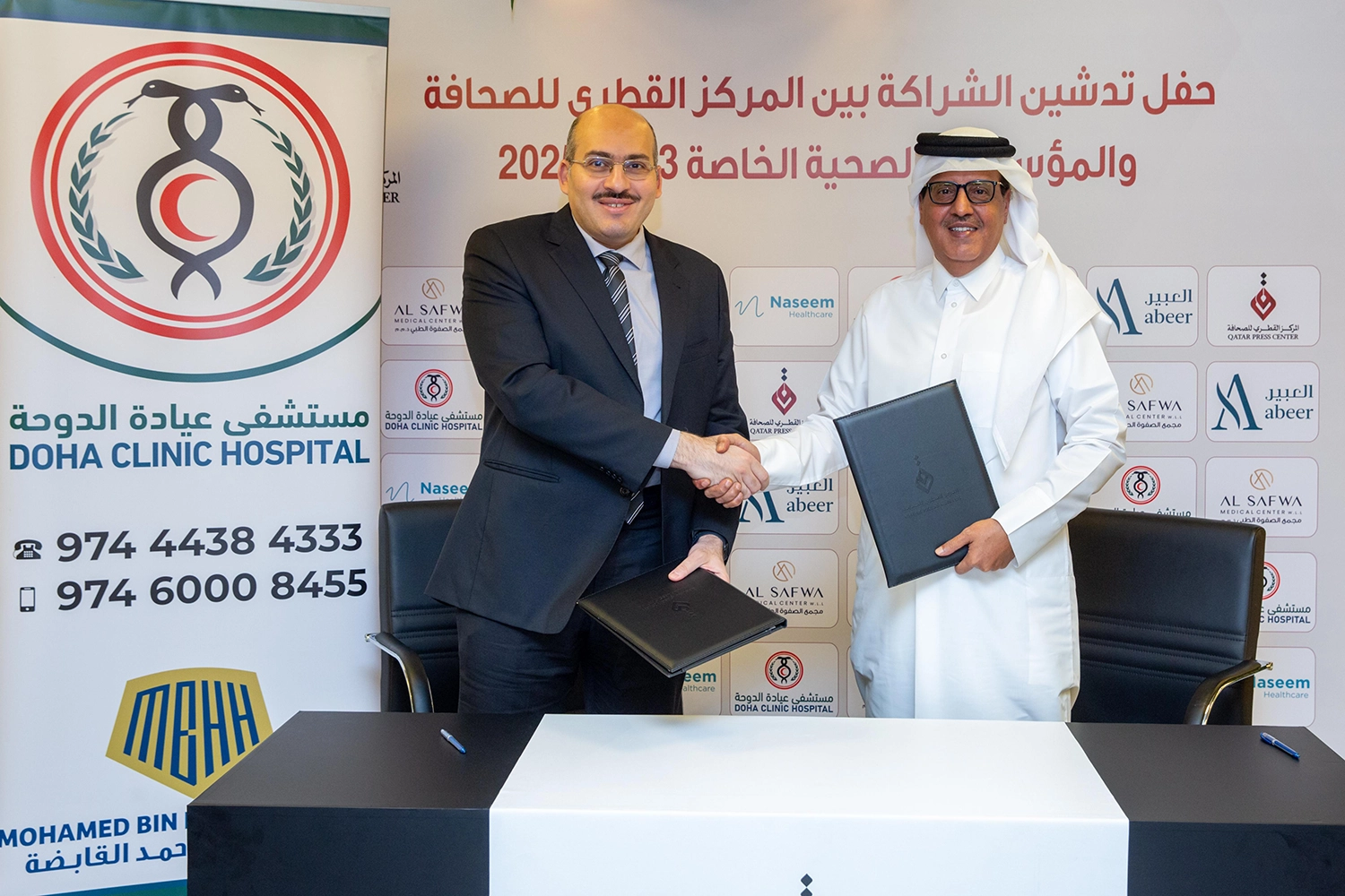 جرت مراسم التوقيع في قاعة "عبدالله بن حسين النعمة" بمقر المركز، بحضور ممثلي المؤسسات الصحية المشاركة، وهي: مستشفى عيادة الدوحة، مركز الصفوة الطبي، مجمع العبير الطبي، ومركز نسيم للرعاية الصحية.